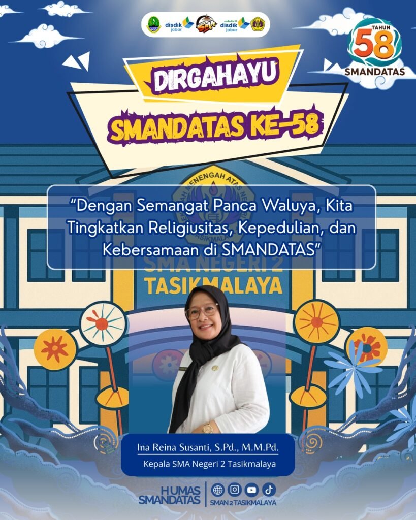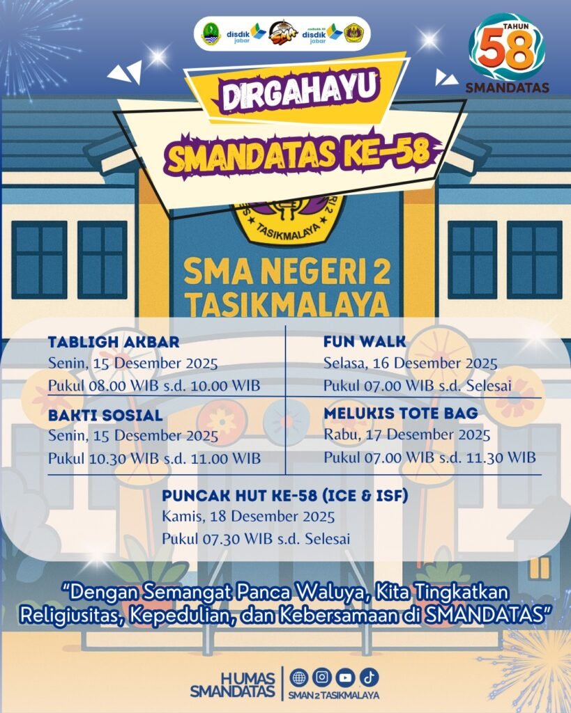 SMANDATAS 58th Anniversary Desember 13, 2025 Tidak ada komentar Dalam rangka merayakan hari jadi yang ke-58 SMAN 2 Tasikmalaya menyelenggarakan beberapa agenda kegiatan yaitu :